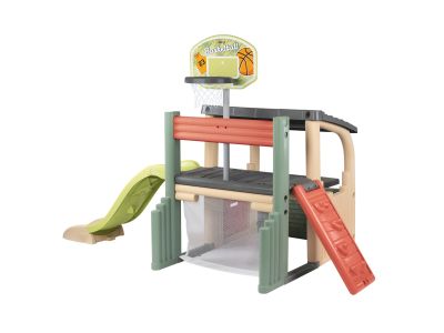Cette aire de jeux encourage le jeu actif en plein air. Les enfants peuvent jouer au football, s'entraîner au lancer avec le panier de basket, ou encore s'amuser à grimper et à glisser. Pendant les chaudes journées d'été, il suffit de brancher un tuyau d'arrosage au toboggan pour le transformer en un amusant toboggan aquatique, idéal pour se rafraîchir et s'amuser dans l'eau.