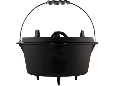 Ce Dutch Oven est équipé de pieds pratiques, vous permettant de placer la cocotte de manière stable directement sur les braises chaudes. Le couvercle est également doté de pieds, vous pouvez donc le retourner et l'utiliser comme une plaque de cuisson ou une poêle à frire à part entière. Grâce aux pieds présents sur la cocotte et sur le couvercle, vous pouvez empiler plusieurs cocottes de manière efficace. Le rebord surélevé du couvercle empêche les briquettes et les cendres de tomber lorsque vous souhaitez créer une chaleur par le dessus.